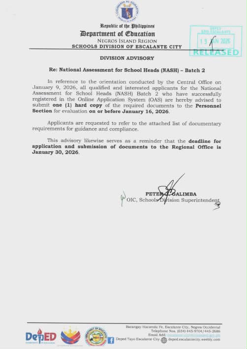 Republic of the Philippines Department of Education DIVISION OF ESCALANTE CITY SDO Escalante PASIDUNGOG 2025 ANNOUNCEMENTS SUBMISSION OF APPLICATION FOR TEACHER-I POSITIONS IN KINDERGARTEN, ELEMENTARY, JUNIOR HIGH SCHOOL, AND SENIOR HIGH SCHOOL FOR SCHOOL YEAR 2026-2027 DIVISION MEMORANDUM 2026 DM-NO.-014-S.-2026-PERFORMANCE-MANAGEMENT-AND-EVALUATION-SYSTEM-PMES-CYCLE-TIMELINE-FOR-SCHOOL- DM-NO.-013-S.-2026-FOURTH-QUARTER-DIVISION-PROGRAM-IMPLEMENTATION-REVIEW-AND-PERFORMANCE-ASSESSME DM-NO.-012-S.-2026-DIVISION-SCREENING-AND-VALIDATION-OF-ATHLETES-COACHES-AND-CHAPERONES DM-NO.-011-S.-2026-PROGRAM-IMPLEMENTATION-REVIEW-OF-SCHOOL-BASED-FEEDING-PROGRAM-IMPLEMENTATION DM-NO.-010-S.-2026-DIVISION-FUND-DAY DM-NO.-09-S,-2026-ADMINISTRATION-OF-COMPUTER-BASED-NATIONAL-CAREER-ASSESSMENT-EXAMINATION-CB-NCAE-FOR-SCHOOL DM-NO.-008-S.-2026-9TH-DIVISION-BIBLE-MONTH-CULMINATION DM-NO.-007-S.-2026-OTHER-STAFF-IN-THE-SCHOOLS-DIVISION-OFFICE-SDO-AUTHORIZED-FOR-REIMBURSEMENT DM-NO.-006-S.-2026-CONDUCT-OF-THE-THIRD-DIVISION-QUARTERLY-UNIFIED-ASSESSMENT-DQUA-FOR-SY-2025- DM-NO.-005-S.-2026-DIVISION-CAPACITY-BUILDING-FOR-ASPIRING-SCHOOL-HEADS-PROJECT-SHINE DM-NO.-004-S.-2026-SUBMISSION-OF-APPLICATION-FOR-TEACHER-I-POSITIONS-IN-KINDERGARTEN-ELEMENTARY DM-NO.-003-S-2025-CORRIGENDUM-TO-DM-NO.-380.-S.-2025-REITERATIO-OF-THE-GUIDELINES-AND-PROCESS-1 DM-NO.-003-S-2025-CORRIGENDUM-TO-DM-NO.-380.-S.-2025-REITERATIO-OF-THE-GUIDELINES-AND-PROCESS-1 DM-NO.-002-S.-2026-TECHNICAL-ASSISTANCE-AND-REORIENTATION-FOR-ADMINISTRATIVE-OFFICER-II-AO-II DM-NO.-001-S.-2026-WORKSHOP-CONFERENCE-ON-THE-SUBMISSION-OF-CY-2025-BUDGET-AND-FINANCIAL REPUBLIC OF THE PHILIPPINES All content is in the public domain unless otherwise stated. ABOUT GOVPH Learn more about the Philippine government, it’s structure, how government works and the people behind it.GOV.PHOfficial Gazette GOVERNMENT LINKS Office of the PresidentOffice of the Vice PresidentSenate of the PhilippinesHouse of RepresentativesSupreme CourtCourt of AppealsSandiganbayan
